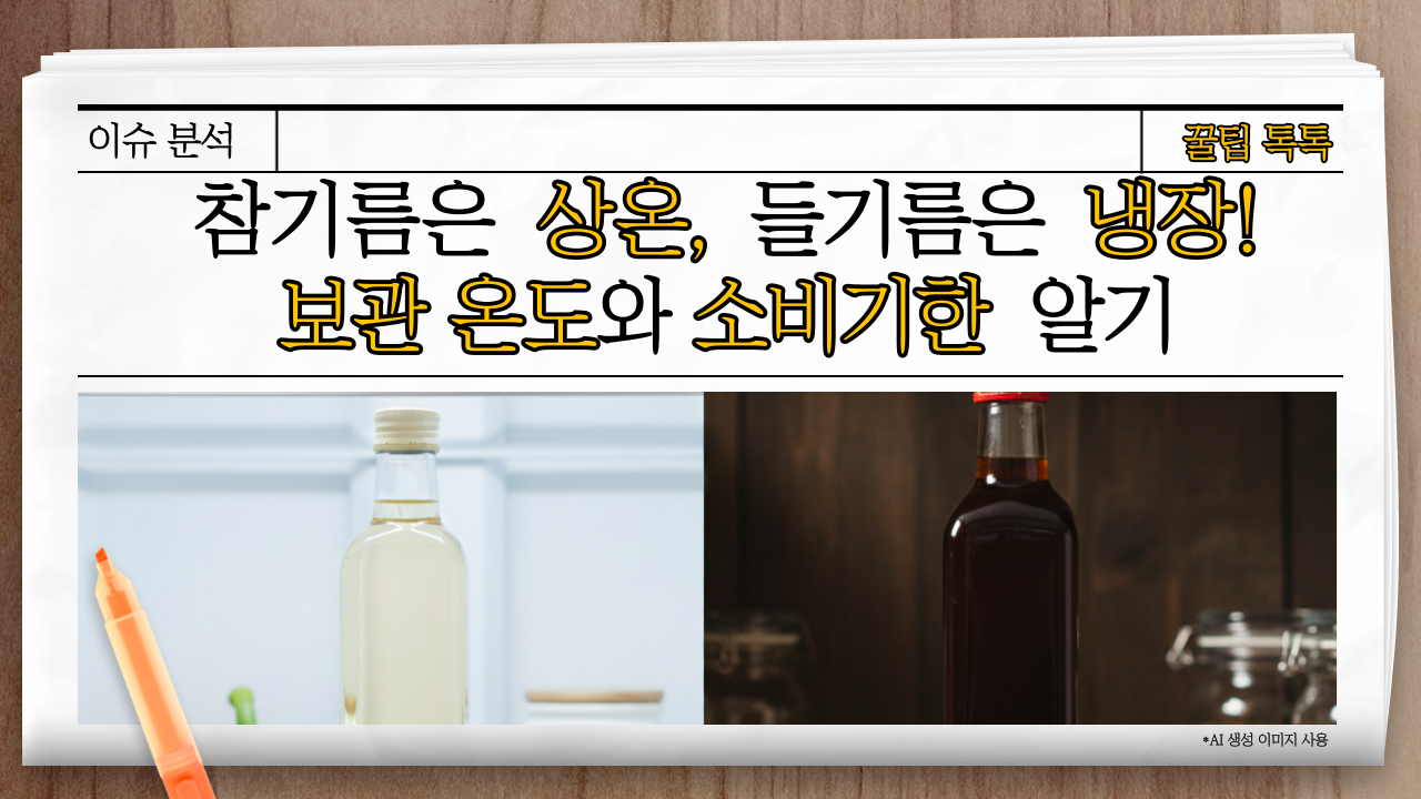 👋 안녕하세요, 최신 이슈를 분석하는 꿀팁톡톡입니다.설 연휴를 약 열흘 정도 앞둔 2월 5일 목요일 오전입니다. 이제 슬슬 고마운 분들에게 보낼 선물을 고르거나, 혹은 반가운 택배 상자들이 집으로 하나둘 도착하기 시작하는 시기인데요. 명절 선물 중에서도 가장 실속 있고 반가운 것을 꼽으라면 단연 '참기름·들기름 세트'가 아닐까 싶습니다. 그런데 여러분, 혹시 미리 받은 기름 선물들을 어떻게 보관하고 계신가요? "기름이니까 다 똑같겠지"라며 식탁 위나 가스레인지 옆 조리대에 나란히 올려두지는 않으셨나요? 안타깝게도 참기름과 들기름은 이름만 비슷할 뿐, 성질은 완전히 정반대입니다. 특히 보관법을 잘못 알면 비싼 국산 기름이 향긋한 양념이 아닌, 우리 가족의 건강을 위협하는 1급 발암물질로 변할 수 있어 주..